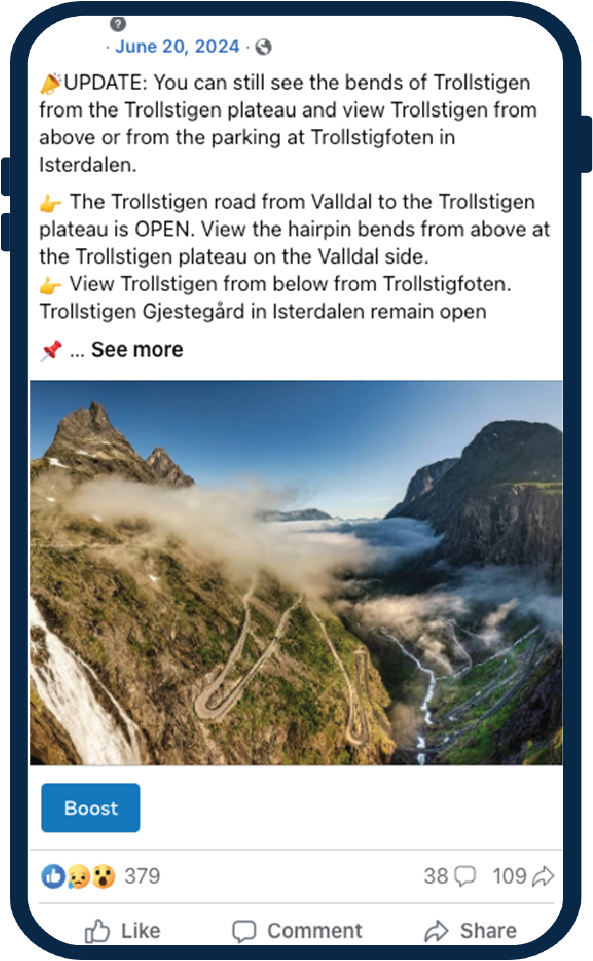 Antall følgere på både facebook og instagram har lagt stabilt gjennom året. Vi har 224.000 følgere på Facebook (nedgang på ca. 1.000) og 105.000 på Instagram. (oppgang på ca. 4.000)